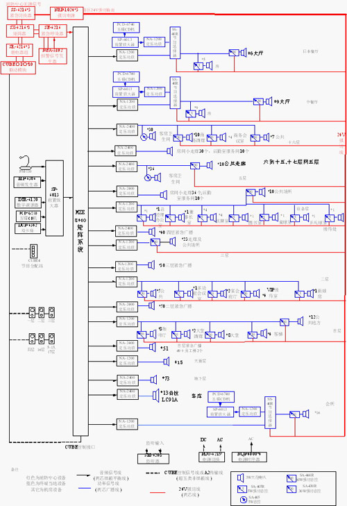 1???????? 本酒店擴(kuò)聲系統(tǒng)包括室內(nèi)外兩個部分,室內(nèi)部分分背景音樂公共區(qū)域,客房消防報警區(qū)域,和會議室,宴會廳,西餐廳等需要本地音源和控制室音源的區(qū)域。